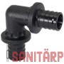 Pressfitting, hergestellt aus dem Hochleistungskunststoff PPSU. Winkel 90° mit Stützkörper, O-Ringen und jeweils zwei auf den Fittingen fixierten Edel ...