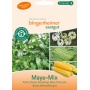 Aussaat: Anzucht ab Mitte Apr, im Freiland Mai- Mitte Juni Erntezeit: Anf. August - Mitte Oktober Inhalt reicht für ca. 4 m²; Pflanzabstand Mais: 30 cm in der Reihe, 60 cm zwischen den Reihen. Kürbis: 50-60 cm entfernt von Mais und Bohnen, 1m entfernt vom nächsten Kürbis. Bohnen: pro Maispflanze 1-2 Körner ca. 5 cm von den Pflanzen entfernt ; Höhe der Pflanzen bis 2 m Saatgut bitte trocken, kühl und im Dunkeln lagern! Saatgut nicht zum Verzehr geeignet. Der Maya-Mix, auch als ?Milpa? bekannt, ist eine jahrtausendalte Mischkultur aus Mittel- und Nordamerika. Diese ideale Kombination von Mais, Bohnen und Kürbis bringt auch in unseren Gärten eine gute Ernte auf kleinstem Raum und bereichert unsere Böden. Zuckermais (Tramunt) dient der Stangenbohne (Neckarkönigin) als Kletterhilfe. Die Bohnen sammeln mit Hilfe der Knöllchenbakterien und den Wurzeln Stickstoff und geben dem Boden einen Teil der Nährstoffe zurück, die der Mais verbraucht. Der Kürbis (Sweet Dumpling) bedeckt die Erde und hält sie feucht, was für das