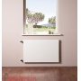Zehnder Radiapaneel, Heizkörper als Heizwand mit horizontal übereinander oder vertikal nebeneinander angeordneten Wasser führenden Profilrohren aus Stahl, mit oder ohne zusätzliche Konvektionslamellen, flache Profilrohre 70 x 11 x 1,5 mm ohne Luftspalt mit Sammelrohren verschweißt, grundiert und lackiert mit Pulver-Beschichtung nach DIN 55900 im Farbton RAL 9016. Wärmeleistung geprüft nach EN 442, mit CE-Kennzeichnung. Heizkörper entspricht den Richtlinien der Gesetzlichen Unfall-Versicherer (GUV), Heizkörper mit Lamellen in Verbindung mit einem Abdeckgitter, Ausführungen 1- und 2-lagig ohne Lamellen ausgezeichnet für die Erfüllung hoher hygienischer Anforderungen, geeignet für die Installation in Gesundheits-Einrichtungen. Anschlüsse 4 x 1/2" Innengewinde stirnseitig, mit rückseitig angeschweißten Aufhängelaschen. Ausführungen Completto oder Durchbruch mit integriertem, voreinstellbarem Ventileinsatz AV6 (Oventrop), links oder rechts, Anschlüsse mit 2 x 1/2" Innengewinde nach unten mit 50 mm Abstand, Entlüft
