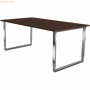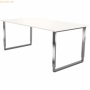Höhenverstellbarer Schreibtisch mit Kufengestell. Der Bürotisch aus Holz und Edelstahl ist in der Höhe von 680 bis 820 mm höhenverstellbar und ist mit einem horizontalen Kabelkanal ausgestattet Tischplatte aus E1 Gütespan, melaminharzbeschichtet, mit ABS Kante 2 mm stark Tischplattenstärke 25 mm stabiles Kufen-Gestell in Edelstahl Kufengestell 50 x 25 mm mit 40 x 20 mm Kabelkanal unter der Tischplatte zur einfachen Verkabelung optional mit Anbautisch in gleicher Bauart optional auszurüsten mit einer Knieraumblende 1550 mm breit und 300 mm hoch