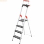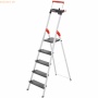 Alu-Sicherheitstreppe mit klappbarem Sicherheitsbügel. Holme, Stufen und Sicherheitsbügel aus hochwertigem eloxiertem Aluminium Zwei rote Entriegelungsgriffe Praktische Multifunktions-Ablageschale (ab 3-stufiger Ausführung) Zum Transport oder zum Verstauen kompakt zusammenklappbar (13 cm tief) Extra breite Trittstufen (205 x 360 mm) für optimalen Steh-Komfort Trittstufen sind mit extrem rutschhemmenden Einlagestreifen ausgestattet Integrierte Leichtlaufrollen für den einfachen Standortwechsel Extrem stabile Bauart Vollflächig aufliegende Kunststoff-Füße sorgen für einen festen Stand Belastbar bis 150 kg Stufen: 5 Arbeitshöhe: max. 285 cm Gewicht: 14 kg