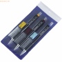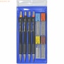 Mit 2 Kniegelenken, matt vernickelt. Arbeitsbereich bis 360mm Durchmesser mit Verlängerungsstange 560mm Durchmesser. Bleibüchse im Klarsichtetui. Inhalt: des 10-tlg. Sets: Schnellverstellzirkel 429010. Radiergummi, Adapter, Bleibüchse. Je 1x Feinminen- Druckstift 0,3/ 0,5/ 0,7. Je 15 Feinminen 0,3/ 0,5/ 0,7 HB. Besonderheiten Feinminen- Druckstifte gummierte Griffzone, voll versenkbares 3mm langes Führungsrohr, bei 0,5 +0,7 gefederte Mine. Robuste Metallmechanik verchromte Messingbeschläge inklusive Clip und Radiergummi. Farbring in ISO- Farben zur Erkennung der Minenstärke. Besonderheiten Feinminen: Super Hi. Polymer Feinmine mit hoher Elastizität und Deckkraft, Strichstärken Kennzeichnung durch farbige Etiketten, Dose mit 15 Minen Inhalt.