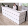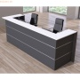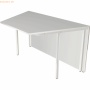Tischplatte / Gestell / Frontplatte Tischplatte/Ablageplatte/Seitenplatten aus E1 Gütespan, melaminharzbeschichtet, mit ABS Kante 2 mm stark Tischplattenstärke 19 mm stark Tischplatte serienmäßig mit Kabeldurchlassdose Ablage- und Seitenplatten 19 mm stabiles Stahlgestell weiß pulverbeschichtet Front aus melaminharzbeschichteter Spanplatte Zierstreifen in Edelstahloptik 20 mm hoch Raumbedarf (inkl. Bewegungfläche) T 200 cm, B 300 cm Beleuchtung und Stauraumelemente optional, nicht im Lieferumfang enthalten