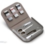 Wer viel unterwegs ist, freut sich über leichtes Gepäck. Das Set ALEGRO ist dafür der perfekte Reisebegleiter. Elegant in schlammgraues Leder und Edelstahl gehüllt, enthält es ein vierteiliges Nagelset sowie ein Nähset bestehend aus Nadeln, Garn und Knöpfen. + Material: Graues Leder, Edelstahl, magnetischer Verschluss + Maße: 12,4 x 10 x 2,5 cm + Design: Flip Design + Nagelknipser + Pinzette + Nagelfeile + Nähzubehör