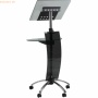 Ein dekoratives, mobiles Beamerstativ mit geringem Platzbedarf für moderne Tagungs- und Konferenzräume. Das hochwertig verchromte Trägergestell mit fünf feststellbaren Laufrollen verleiht dem Stativ die erforderliche Stabilität. Die Stativhöhe ist von 105-145 cm individuell einstellbar. Eine gebogene Frontplatte aus klarsichtigem, rauchfarbenem Methacrylat bietet dem Referenten eine leichte optische Abgrenzung zum Publikum. Beide Trägerplatten zur Aufnahme von Datenvideoprojektor und Notebook sind aus spezial-gehärtetem Sicherheitsglas. Das Beamerstativ RD 3040 Spot bildet zusammen mit dem Rednerstativ RD 3070 Spot und dem Flipchart RD 3000 Mirror eine Produktfamilie mit durchgängiger Formensprache. Manuskriptauflage höhenverstellbarVon 105-145 cm Untere Trägerplatte individuellfeststellbar Sternfuß mit 62 cm Durchmesserund 5 feststellbaren Laufrollen Stativ und Fußgestell ausverchromtem Stahl Durchmesser 50mm Gehärtete Glasplatten (ESG)